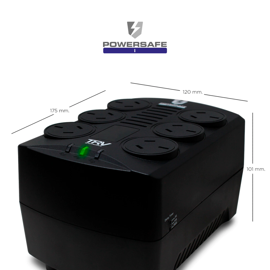 La familia de estabilizadores de tensión TRV POWERSAFE 2i fue desarrollada para la protección de equipamientos electrónicos tales como: PC, PC gamer, PC CAD, notebook, router, modem, etc., electrodomésticos como heladeras, freezer, etc. equipos de la línea marrón como ser equipos de audio, TV con diferentes tecnologías de pantallas, estaciones de juego u otros aparatos eléctricos que sean sensibles a las variaciones de tensión que ocurren en las redes de distribución eléctrica. Estabilizador de tensión POWERSAFE 2i /6 tomas IRAM /retardo de conexión /protección RJ-45. Potencia 500W