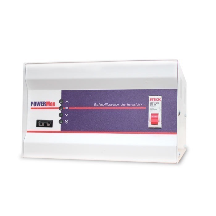 Estabilizador electrónico de tensión POWERMAX 1800 B /Potencia Máx 1800 VA /4 pasos estabilización /Bornera entrada/salida /LLave de encendido termomagnética /Protección sobrecarga/cortocircuito /Gabinete de chapa